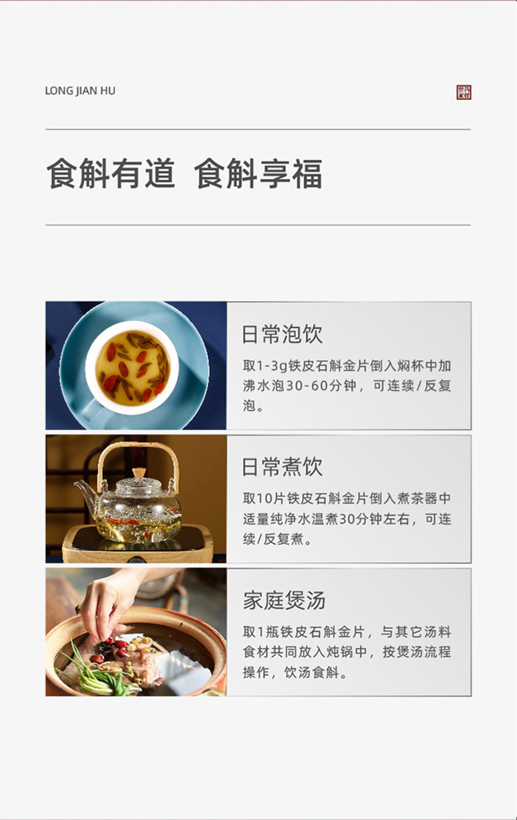 食法一:取铁皮石斛金片1-5克,保温杯闷泡或养生壶煮饮,可连续泡/煮饮,饮水食斛,营养不浪费,滋补加倍。